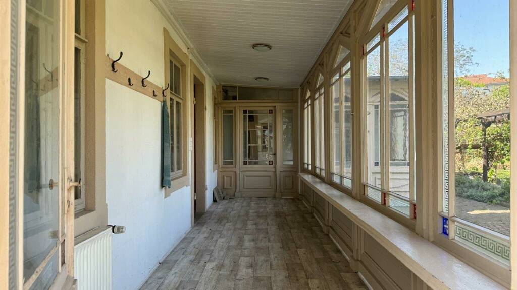 Die Ziller-Villa mit einer Wohnfläche von ca. 160 m² weist einen erhöhten Sockel auf und ist teilweise unterkellert (Gewölbe). Vom Hof gelangt man über den wunderschönen erhaltenen Veranda-Anbau mit historischer Tür und Fenstern mit besonderen Glaselementen ins Haus. Im Erdgeschoss sind 3 helle Wohnräume, eine Küche mit Einbauküche und großer Speisekammer, Abstellräume sowie ein großzügiges Vollbad vorhanden. Das Wohnzimmer ist mit einem Kaminofen ausgestattet und bietet Zutritt zum 1997 angebauten und beheizbaren Wintergarten. Die moderne Gas-Hybridheizung befindet sich im Seitengebäude. Das Obergeschoss mit einem traumhaften Rundumblick verfügt über 3 weitere Zimmer, einen Vorraum sowie ein großes Gäste-WC mit Option auf Erweiterung zu einem Vollbad. Die alten Holztüren sind wunderbar erhalten.