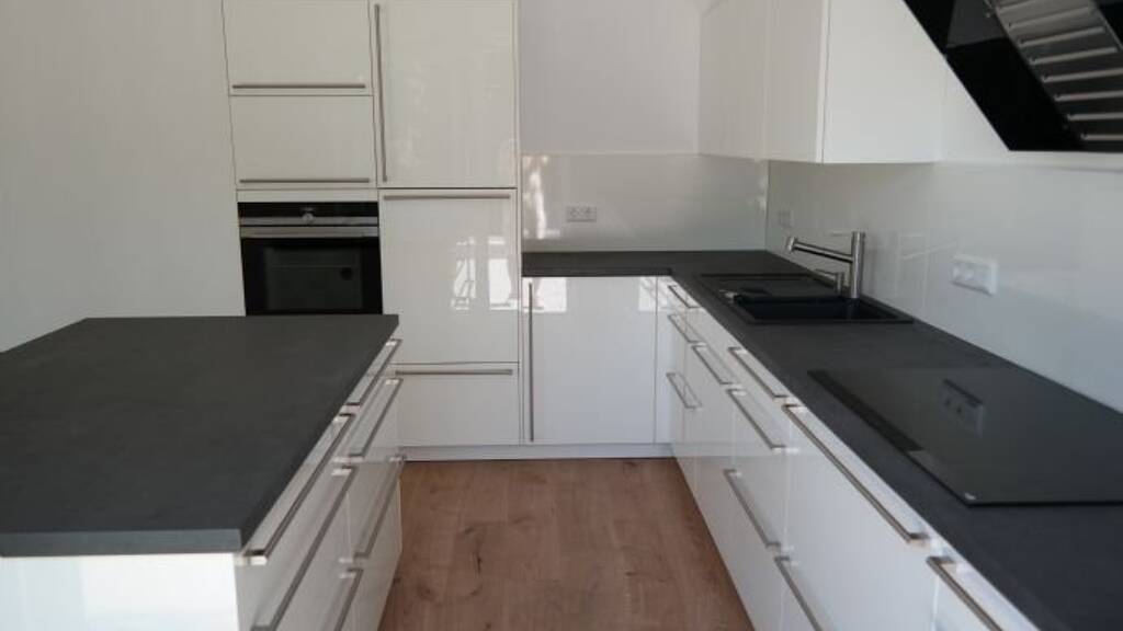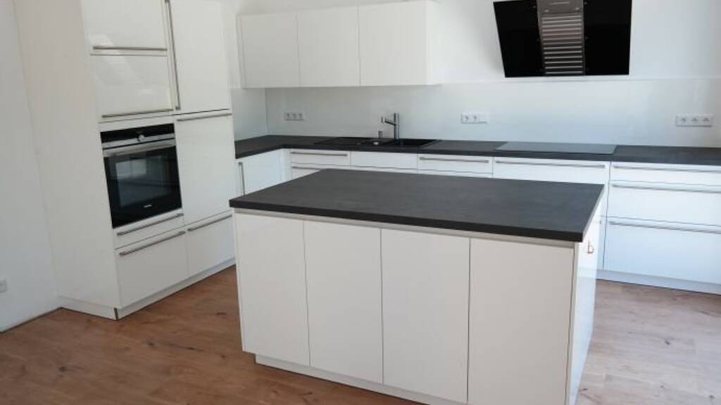 Die Wohnung hat eine große, hochwertige Einbauküche mit Kücheninsel, Backofen, Induktionskochfeld samt Dunstabzugshaube und Spülmaschine.