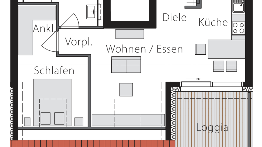 Der gemütliche, offene Wohn-Essbereich mit Zugang zur Loggia ist durchdacht und lädt zum Wohlfühlen ein. Das Schlafzimmer hat eine zusätzliche Ankleideecke und auch in der Diele ist genug Stauraum vorhanden.