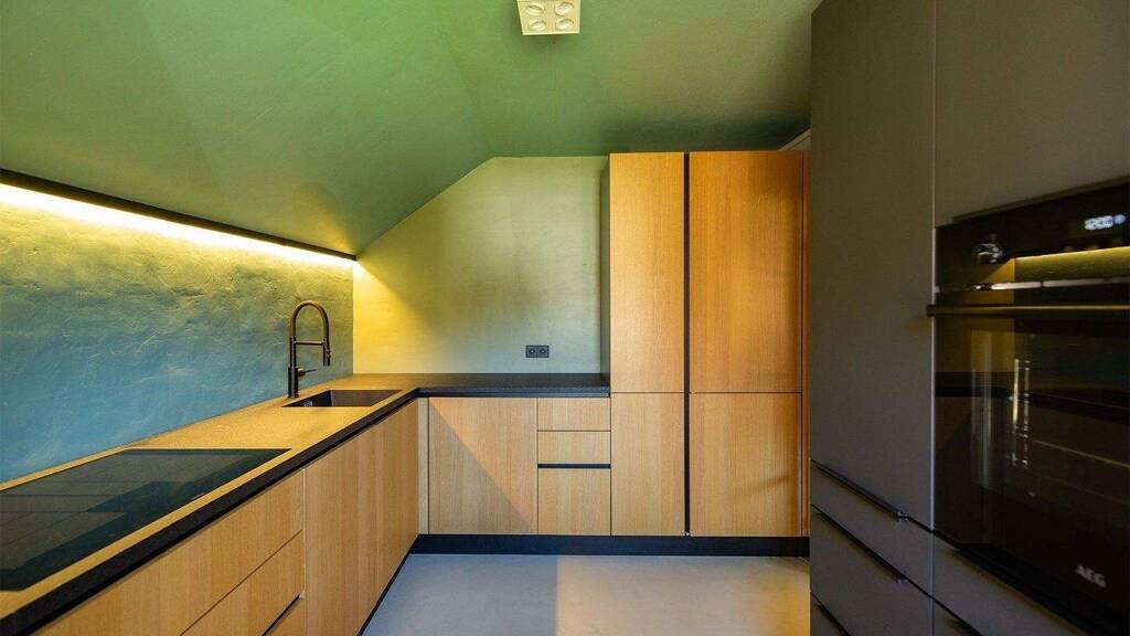 Ein besonderes Highlight dieser Immobilie bildet die hochwertige Vollholzküche eines namhaften Herstellers mit Markenküchengroßgeräten sowie einem Waschtrockner. Ein praktischer Apothekerschrank sorgt hierbei für viel Stauraum. Mit Blick ins Grüne genießen Sie hier Kochen in modernem und gleichzeitig sehr hochwertigem Ambiente. Stilvolle Wände in Betonoptik sowie ein heller Epoxidharzboden unterstreichen den modernen Charakter und schaffen eine besondere Atmosphäre, die auch Ihre Gäste begeistern wird.