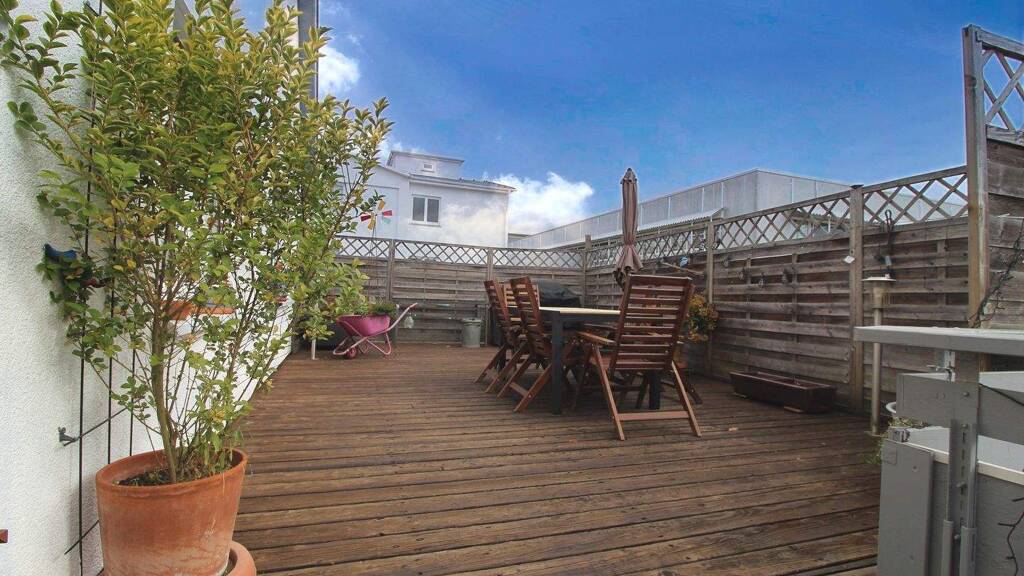 Die Dachgeschosswohnung wurde später ausgebaut und umfasst ca. 80 m² Wohnfläche. Auch hier sind Wohnzimmer-, Ess- und Küchenbereich offen gestaltet. Das Badezimmer ist mit Dusche, Anschlüssen für Waschmaschine, Waschbecken und Toilette ausgestattet.