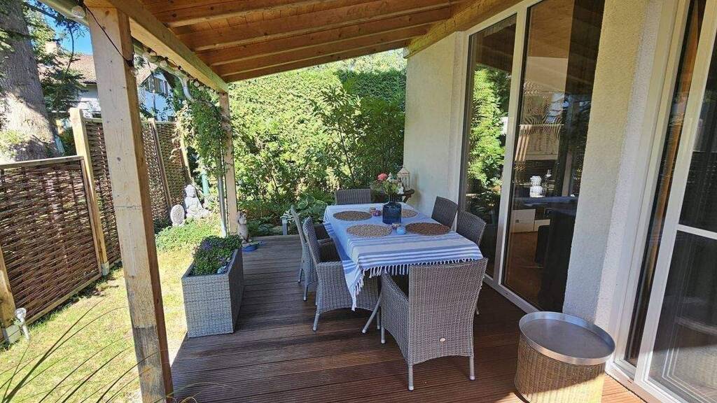 * Der liebevoll gestaltete Garten bietet Ihnen Ruhe und Privatsphäre. Bei der Überdachung kann man sowohl sonnige und regnerische Tage genießen.