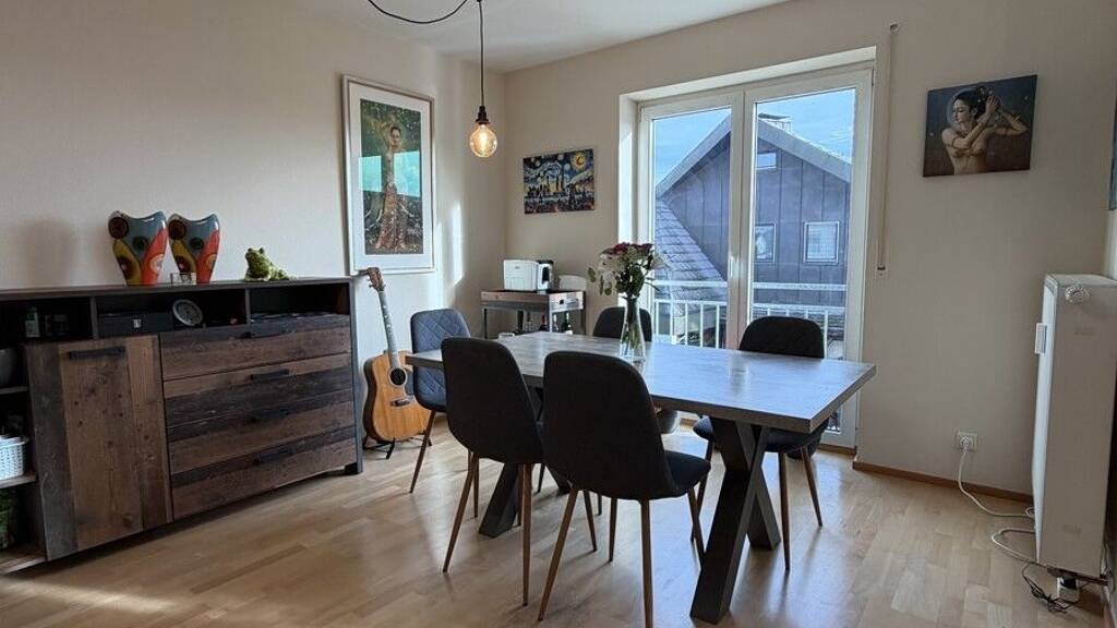 Diese helle drei Zimmer Wohnung liegt im ersten Obergeschoss eines gepflegten sechs Parteienhaus. Über das mit Naturstein geflieste Treppenhaus gelangt man zur Wohnung. Durch den Wohnungsflur erreicht man das großzügig nach Südwesten ausgerichtete Wohn- und Esszimmer, welches mit einem hochwertigen Parkettboden und bodentiefen Fenstern ausgestattet ist. Die mit einer langen Zeile ausgestatteten Küche befindet sich direkt im Anschluss an den Wohn- und Essraum. Highlight dieser tollen Wohnung ist der große und sonnige Balkon, von hier aus haben Sie einen Blick über die Felder und können bei einem Glas Wein gemütlich den Sonnenuntergang genießen.