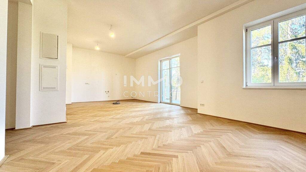 Die gegenständliche Wohnung überzeugt auf ca. 84,77 m² Wohnfläche durch ein großzügiges, repräsentatives Raumkonzept und eine außergewöhnliche Raumhöhe von rund 3,08 m, die ein besonders offenes und elegantes Wohngefühl vermittelt. Herzstück ist der ca. 41 m² große Wohn- und Essbereich mit beeindruckender Raumwirkung und direktem Zugang zum rund 9,6 m² großen Balkon mit ruhigem Grünblick. Großzügige Fensterflächen sorgen für optimale Lichtverhältnisse und unterstreichen den hochwertigen Wohncharakter.