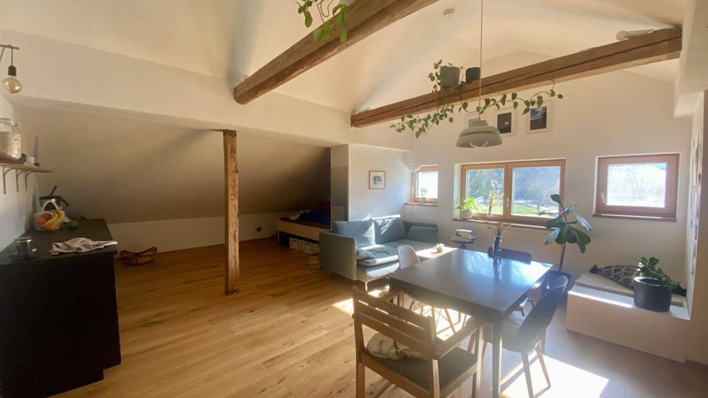 Gemütliche 2-Zimmer-Wohnung im Dachgeschoß eines Hauses mit nur zwei Wohneinheiten im Kuchler Ortsteil Georgenberg. Ein besonderes Highlight ist der schöne Berg- und Naturblick sowie der überaus großzügige Gemeinschaftsgarten. Ein überdachter Kfz-Stellplatz rundet das Angebot ab.