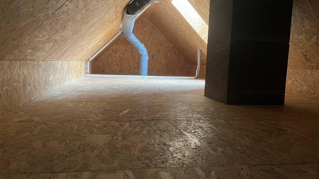 Insgesamt befinden sich im Haus 5 Räume. Im Erdgeschoß liegt die großräumige Küche mit offenen Wohn-/Essbereich. Dieser wirkt durch die große Fensterfront sehr hell und aufgeschlossen. Der Zugang zur Terrasse erfolgt über den Küchenbereich. Weiterhin befinden sich im Erdgeschoß ein Gäste WC sowie der Hauswirtschaftsraum. Über eine Holztreppe aus Eiche gelangt man in das Obergeschoß. Im Obergeschoss befinden sich drei weitere Räume, das Bad mit Badewanne und Dusche sowie der Zugang zum Dachboden. Dieser bietet zusätzlichen Stauraum.