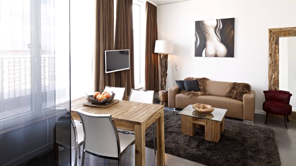 Dieses moderne und geräumige Apartment mit 2,5 Schlafzimmern bietet Platz für bis zu 6 Personen. Zwei separate Schlafzimmer mit gemütlichen Doppelbetten bzw. einem ausziehbaren Sofa und Flachbildfernseher bieten ausreichend Platz zum Entspannen. Der Wohnbereich verfügt über eine gemütliche Sitzecke mit Sofa und Sesseln sowie einen Flachbildfernseher. Darüber hinaus verfügt das Apartment über einen zusätzlichen Raum mit Schlafsofa, Schreibtisch und Flachbildfernseher, der durch eine Glastür mit dem Hauptwohnbereich verbunden ist. Die voll ausgestattete Küche mit kleiner Essecke bietet alles für den täglichen Bedarf: Glaskeramikkochfeld, Mikrowelle, Wasserkocher, Kaffeemaschine sowie Geschirr und Besteck. Zwei separate Badezimmer mit Dusche, Handtüchern und Haartrockner sorgen für maximalen Komfort. Das Apartment ist in zahlreichen Designstilen verfügbar: mit asiatischem Touch durch Onyxsteine und verschiedene Gelb- und Goldelemente, im mediterranen Stil mit Holzelementen und frischen Farben, futuristisch mit Plexiglas-Komponenten und Natursteinplatten, sowie im Urbane Chalet-Variante mit Holz und Stein in erdigen Tönen.