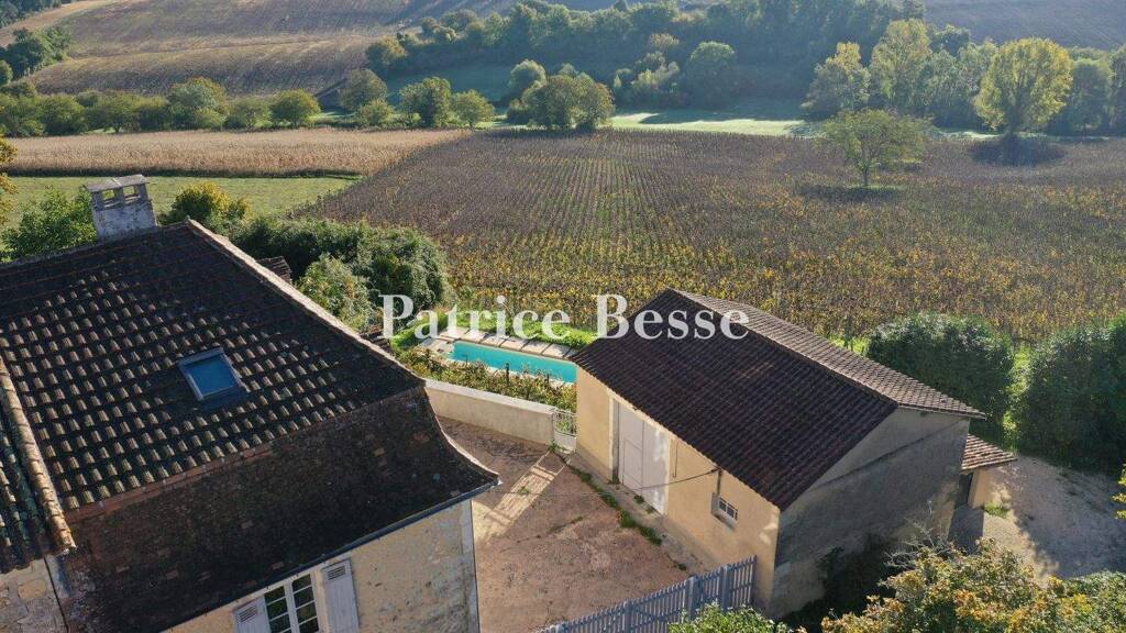 The property looks away from the village. It lies at the end of a narrow cul-de-sac, which is extended by a shady footpath. It is made up of several distinct spaces in terraces. The main dwelling dates back to the mid-19th century. It has a ground floor, a first floor and a second floor in the roof space. It towers upon a plateau and looks eastwards and southwards down at a closed inner court, a former barn and a lean-to garage. This tall, grand house adjoins a medieval dwelling that is not currently lived in. Its base follows the slope to fit with the terrain and make the most of the beautiful view. A mansard roof crowns the house. Gabled dormers and modern skylights dot the roof. The three elevations of exposed stonework are punctuated with large-paned windows with wooden frames, fitted with partly louvred shutters that are painted blue. Renovation work was recently carried out on the property. On the ground floor, the timber beams have been smoothened, the window frames changed, the ceiling repainted and a new kitchen fitted. On the first floor, ceiling boards have been removed, ceiling insulation added and walk-in wardrobes and cupboards fitted. And for the whole place, the electrical system has been revamped, the lap pool renovated and an electric gate fitted in the garage. There is a clear view of the natural surroundings. Lower down, in parallel to a few rows of vines, there is a lap pool. This lap pool is 10 metres long and 2 metres wide. It was built in a spot where swimmers can best admire the sweeping view of the landscape. Work on the lap pool is currently being finished. There is a parking area between the meadow and the lane.