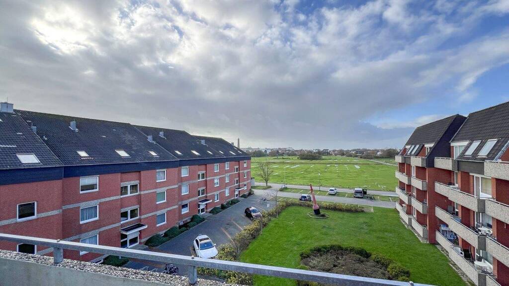 Beide Balkone der Wohnung grenzen direkt aneinander und haben die gleiche Ausrichtung nach Westen. Man blickt von hier aus großer Höhe auf den Innenhof der Wohnanlage und darüber hinaus auf die Borkumer Pferdewiesen bis zum Neuen Leuchtturm. Die Balkone bieten einen wunderschönen Platz um den Sonnenuntergang über der Insel ungestört zu genießen.