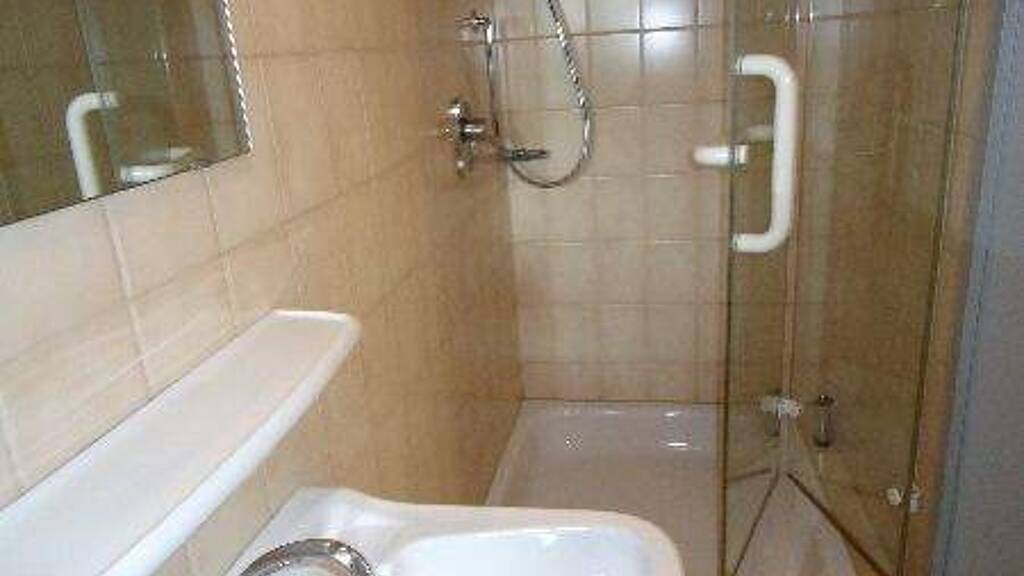 Das Badezimmer ist mit einer Dusche, WC und Waschbecken ausgestattet.
