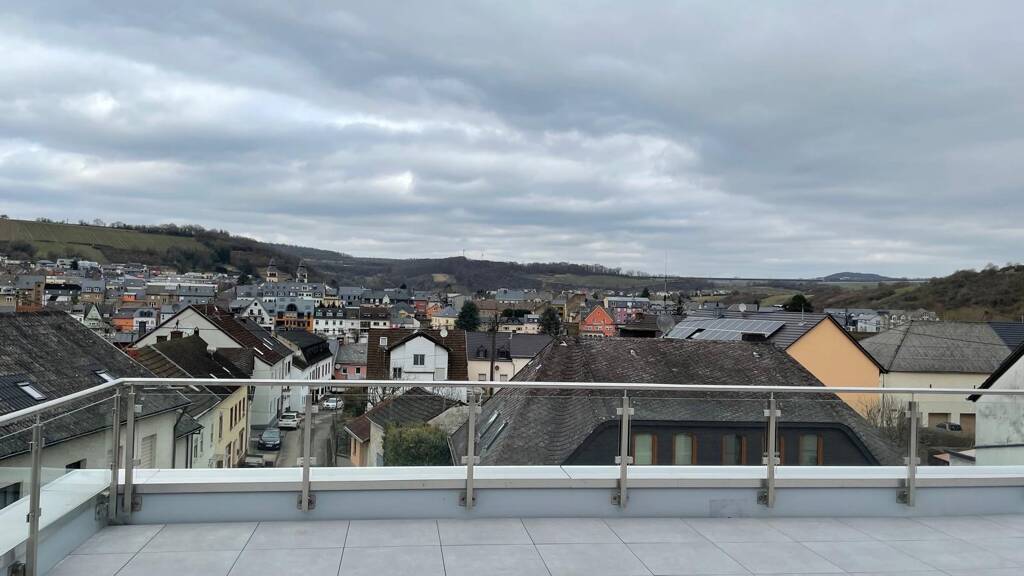 Die ca. 60 m² große Dachterrasse bietet einen beeindruckenden Ausblick über den Ort bis hin zu den luxemburgischen Weinbergen.