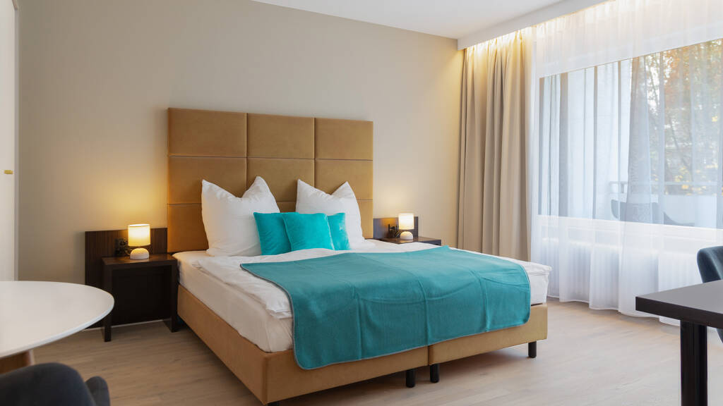 Das Apartment ist unterteilt in ein großes Zimmer mit Schlaf-, Wohn- und Essbereich, sowie ein Schreibtisch, Flur mit separater Studioküche und ein Tageslichtbad. Das möblierte Zimmer bietet viel Raum für 1-2 Personen und ist perfekt geeignet zum Wohnen auf Zeit. Ebenso hat jedes Zimmer einen Zugang vom Apartment auf seinen eigenen komplett möblierten Balkon, der mit dem besonderen Blick in die Weite und ins Grüne zum Entspannen einlädt. Die Zimmer sind alle individuell eingerichtet. Die Bilder sind Beispielbilder. Eine Zuordnung zu einem bestimmten Apartment kann nur nach Verfügbarkeit zugewiesen werden.