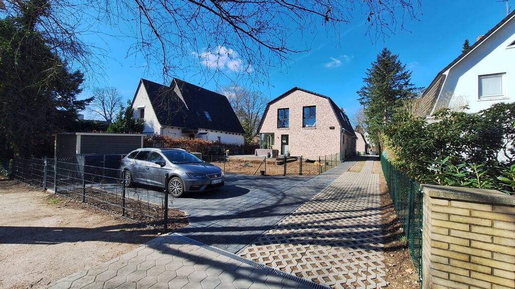 Objektbeschreibung Erstbezug: Moderne und energieeffiziente Doppelhaushälfte inkl. Keller Stellplatz in beliebter, ruhiger Wohngegend am Volksdorfer Wald in Meiendorf. Ohne Makler/ courtagefrei Raumaufteilung Hier wohnen Sie auf geräumigen ca. 135 m² Wohnfläche (nach DIN, inkl. anteiliger Terrassenfläche), die sich ideal auf 4 Zimmer und einen Hobbyraum (UG) sowie 2 Bäder aufteilen. Weiterhin steht ein ca. 20 m² großer Abstellraum als HWR/HAR (UG) zur Verfügung. Sie gelangen in Ihr neues Zuhause über einen Flur mit praktischer Garderobennische, von dem auch das Gästebad mit bodengleicher Dusche sowie hochwertiger Sanitärkeramik erreichbar ist. Die Böden sind mit einem eleganten, dunklen Feinsteinzeug belegt, geflieste Wandbereiche zeigen sich in einer modernen Betonoptik. Ein besonderer Hingucker ist der sich anschließende, großzügig geschnittene und mit Eichenparkett belegte Wohnbereich mit offener Einbauküche samt Tresen und ein zur Sonnenseite orientiertes deckenhohes Eckfensterelement. Die Küche ist mit Einbaugeräten deutscher Markenhersteller ausgestattet. Aus dem Wohnbereich gelangen Sie über eine offene Holztreppe in das Obergeschoss. Hier befinden sich 3 Wohnräume ausgestattet mit großen, meist bodentiefen Fenstern. Alle Zimmer sind mit Antennen- und Datenanschlüssen ausgestattet. Die Zimmer sind ebenfalls mit einem Eichenparkett versehen. Ebenso im Obergeschoss befindet sich das Badezimmer mit Badewanne sowie großzügiger bodengleicher Dusche. Die Sanitärkeramik sowie Armaturen zeigen sich als hochwertige deutsche Markenware. Der Boden des Bads ist mit einem großformatigen, dunklen Feinsteinzeug belegt, die gefliesten Wandbereiche zeigen sich in einer modernen Betonoptik. Der beheizte Hobbyraum im Untergeschoss verfügt über ein Fenster und ist über das offene Treppenhaus direkt erreichbar. Als Bodenbelag wurde ebenfalls ein Eichenparkett verwendet.