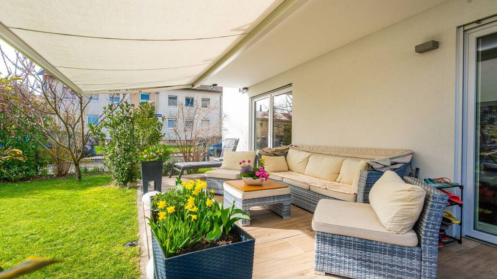Der offen gestaltete Wohn- und Essbereich bildet das Herzstück der Wohnung und besticht durch seine Helligkeit sowie den direkten Zugang in den Außenbereich. Die angrenzenden Terrassen sowie der Garten schaffen eine private Wohlfühloase im Freien. Ob entspannte Stunden im Grünen, gesellige Abende oder Platz für Familie und Hobby - dieser Außenbereich hebt die Wohnqualität auf ein besonderes Niveau.