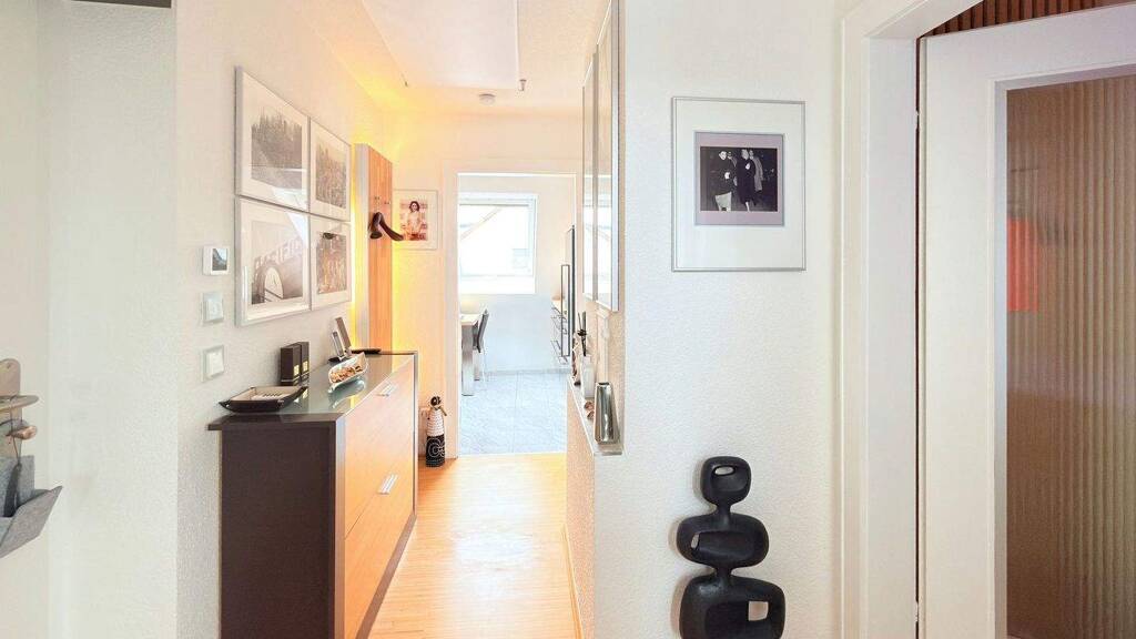 Vom einladenden Flur sind sämtliche Räume komfortabel erreichbar: Wohnbereich, Schlafzimmer, Küche sowie das hochwertig ausgestattete Badezimmer.