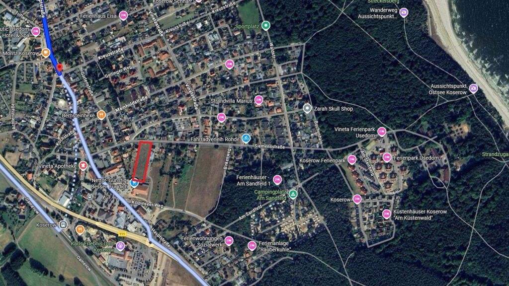 Dieses unbebaute und voll erschlossene Grundstück befindet sich in der ruhigen Siemensstraße am südlichen Ortsrand von Koserow auf der beliebten Insel Usedom. Nur rund 800?m Luftlinie vom Ostseestrand entfernt, bietet es beste Voraussetzungen für Ihr Bauvorhaben - ob Einfamilienhaus, Ferienimmobilie oder ggf. ein Mehrfamilienhaus (nach Abstimmung mit den zuständigen Behörden).