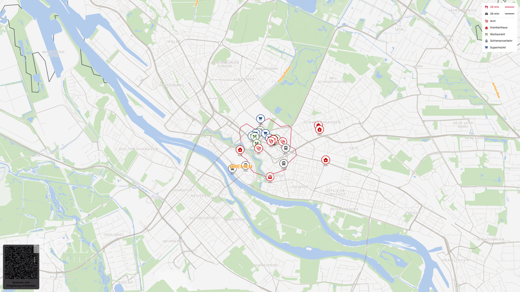 Die medizinische Versorgung ist in der Umgebung sehr gut abgedeckt. In der Nähe befinden sich unter anderem das Ameos Poliklinikum Bremen sowie verschiedene Arztpraxen, beispielsweise OrthoBremen. Auch zahnärztliche Angebote wie Dres. Feyer sind in der direkten Umgebung vorhanden. Für Erholung im Grünen bieten sich mehrere kleine Parks an, darunter der Nelson-Mandela-Park, der sich gut für einen Spaziergang oder eine kurze Auszeit eignet.