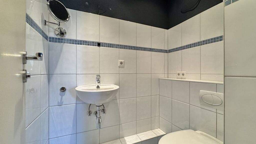 In den Wohnräumen ist ein heller Laminatboden verlegt und die Bäder sowie die Küche sind mit Fliesen versehen. Das Vollbad bietet sowohl eine Badewanne als auch eine Dusche und ist, ebenso wie das separate Gäste-WC, zeitlos mit weißen und grauen Fliesen ausgestattet.