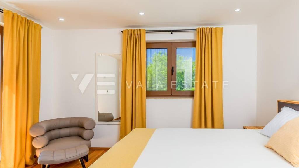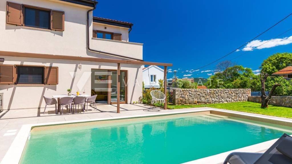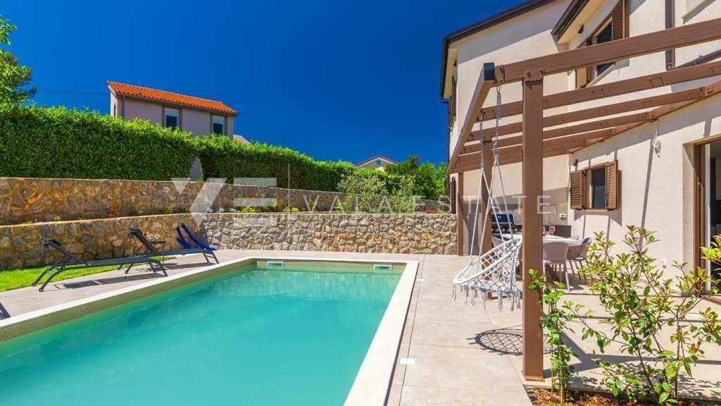Immobilien auf der Insel Krk, der Stadt Krk und ihrer Umgebung in ruhiger Lage in der Nähe der Stadt Krk steht eine neue moderne Doppelhaushälfte zum Verkauf, die 126 m2 Wohnfläche einnimmt und sich über das Erdgeschoss und den ersten Stock erstreckt. Das Erdgeschoss verfügt über eine Eingangshalle, einen Abstellraum mit Waschmaschine und Trockner, eine Toilette, ein Schlafzimmer mit eigenem Bad und ein Wohnzimmer mit Küche und Essbereich mit Zugang zu einer überdachten Terrasse und einem Garten. Im ersten Stock, der durch eine Innentreppe verbunden ist, befinden sich zwei Schlafzimmer mit eigenen Bädern und Zugang zu einer großen Terrasse mit herrlichem Blick in die Natur. Im wunderschön angelegten Garten mit automatischer Bewässerung gibt es einen Swimmingpool mit Liegewiese, eine voll ausgestattete Außenküche mit Grill und einen Bereich für geselliges Beisammensein und Zeit im Freien. Es ist komplett mit neuen modernen Möbeln eingerichtet und wird als solches verkauft. Für den Bau wurden hochwertige Materialien und Ausstattungen verwendet, darunter Keramikböden und Eichenparkett, hochwertige Sanitäranlagen, Multisplit-Klimaanlagen in allen Räumen, Fußbodenheizung, hochwertige PVC- und ALU-Dreischichtfenster und Sicherheitstüren. Zwei Parkplätze befinden sich am Hofeingang. Dieser schöne und hochwertige moderne Neubau befindet sich in ruhiger Lage, nur 3000 m von schönen Stränden und allen Annehmlichkeiten entfernt. Die Agentur Vala Estate Malinska sorgt für eine sichere und transparente Eigentumsübertragung und alle erforderlichen Unterlagen.