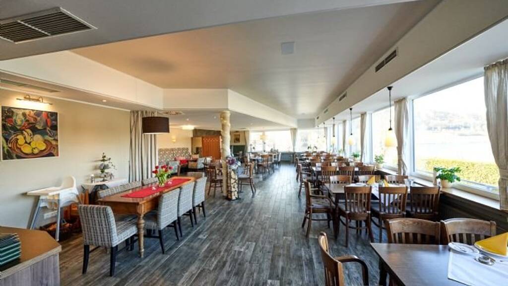 Sowohl vom Gastraum als auch von der teilweise davor liegenden Sonnenterrasse, genießen Sie den herrlichen Ausblick auf das Maar und die einmalige Naturlandschaft der Vulkaneifel. Der obere Terrassenbereich verfügt zudem über eine elektrische Markise, die seine Gäste vor Wind und Wetter schützt. Im unteren Bereich liegt eine weitere gemütliche Gartenterrasse sowie ein Kinderspielplatz für die kleinen Gäste.