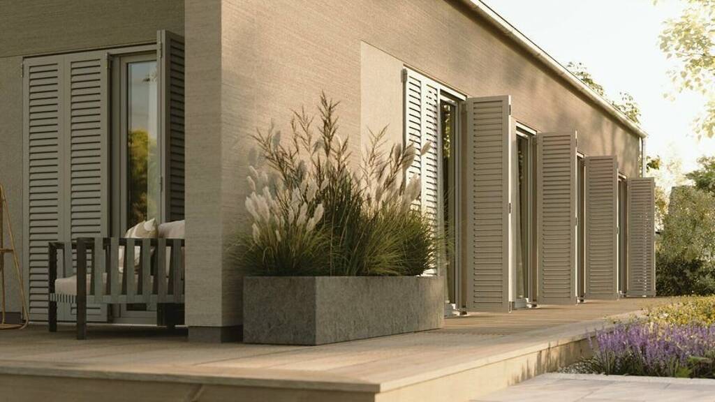 Faltschiebeläden: Sie verpassen deinem Haus nicht nur einen neuen, ausgefallenen Touch, sondern können auch fu¨r die Verdunklung der Zimmer dienen. Es gibt sie in der Sicht- und Wetterschutz-Variante „SUN“, die sich dem Sonnenstand anpassen lässt, oder in der Variante „NATURE“ mit Naturholzstreben.