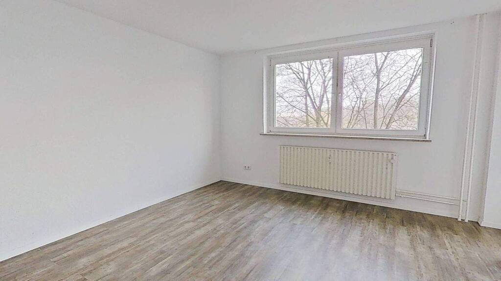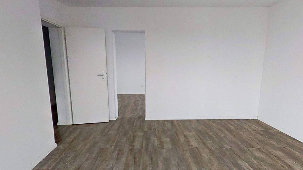 Auch das Schlafzimmer bietet viel Platz zur individuellen Gestaltung. Ein Boden in Holzoptik, der sich auch im Wohn- und Esszimmer sowie dem Flur befindet, verleiht dem Raum eine warme Atmosphäre.