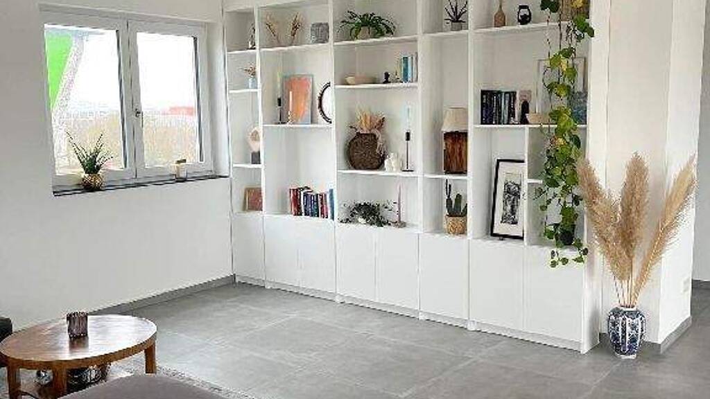 Auf ca. 117 m² Wohnfläche überzeugt die Wohnung durch eine moderne und großzügige Gestaltung. Der gesamte Wohnbereich ist mit einem hochwertigen Vinylboden in Fliesenoptik ausgestattet und wird über eine angenehme Fußbodenheizung beheizt. Der helle, offen gestaltete Wohn- und Essbereich ist harmonisch eingerichtet und verfügt über ein gemütliches Sofa, eine Wohnwand, ein Sideboard sowie einen Esstisch mit sechs Stühlen. Über die große Fensterfront gelangen Sie auf die Terrasse, die mit einer Loungegarnitur, Tisch und Stühlen sowie einem Sonnenschirm ausgestattet ist und zum Verweilen einlädt.