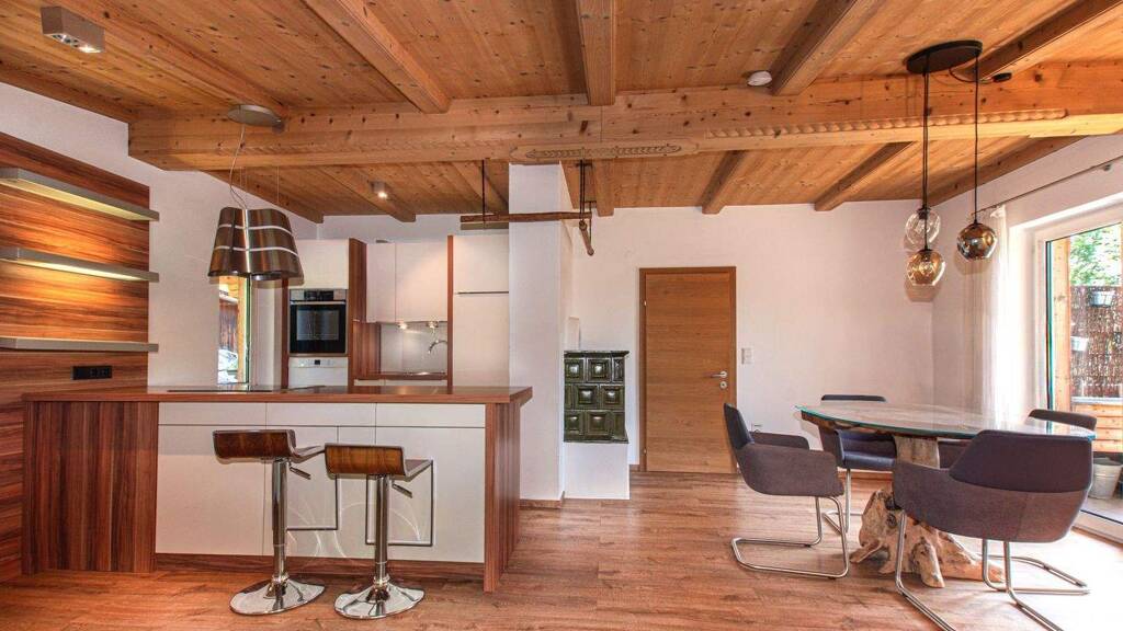 Im Obergeschoss befindet sich der helle Wohn- und Essbereich mit moderner Küche und traditionellem Kachelofen. Direkt angrenzend liegt das Wohnzimmer mit freistehendem Kamin - der perfekte Ort für entspannte Stunden mit Blick auf die umliegende Bergwelt. Ergänzt wird diese Ebene durch ein Badezimmer und einen Flur, der den Zugang zu den einzelnen Bereichen harmonisch verbindet.