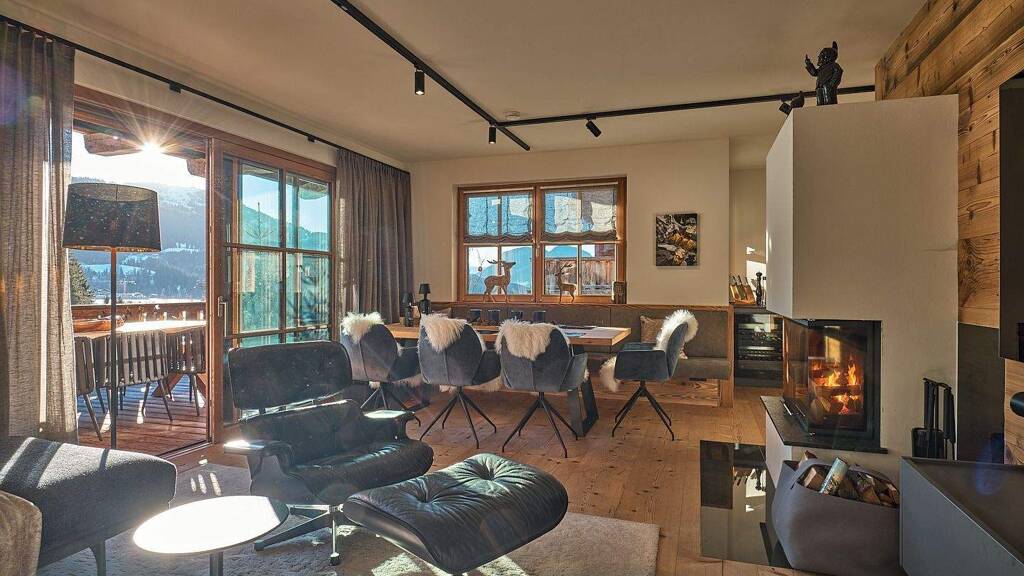 Das Wohnhaus umfasst lediglich fünf hochwertige Wohneinheiten und wurde unter Verwendung ausgewählter Naturmaterialien wie Altholz, Naturstein und Feinstein errichtet. Die Architektur verbindet alpine Elemente mit zeitgemäßer Formensprache und steht für langlebige Bauqualität. Der Zugang zur Wohnung erfolgt über das Erdgeschoss in ein großzügiges Entrée mit Garderobenbereich, von dem aus alle Räumlichkeiten optimal erschlossen werden. Der großzügige, lichtdurchflutete Wohn- und Essbereich begeistert mit alpinem Chalet-Charakter. Ein offener Holzkamin schafft eine warme, gemütliche Atmosphäre. Die sonnige und weitläufige Terrasse bietet spektakuläre Ausblicke und eröffnet einen freien Blick auf Natur und den Hartkaiser im Süden sowie auf das Kaisergebirge im Norden.