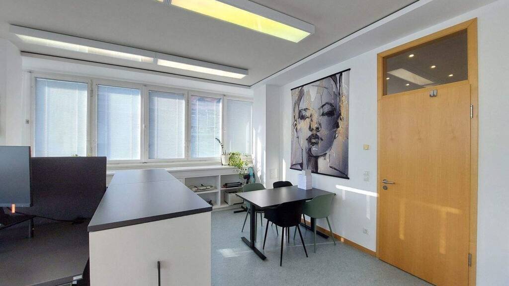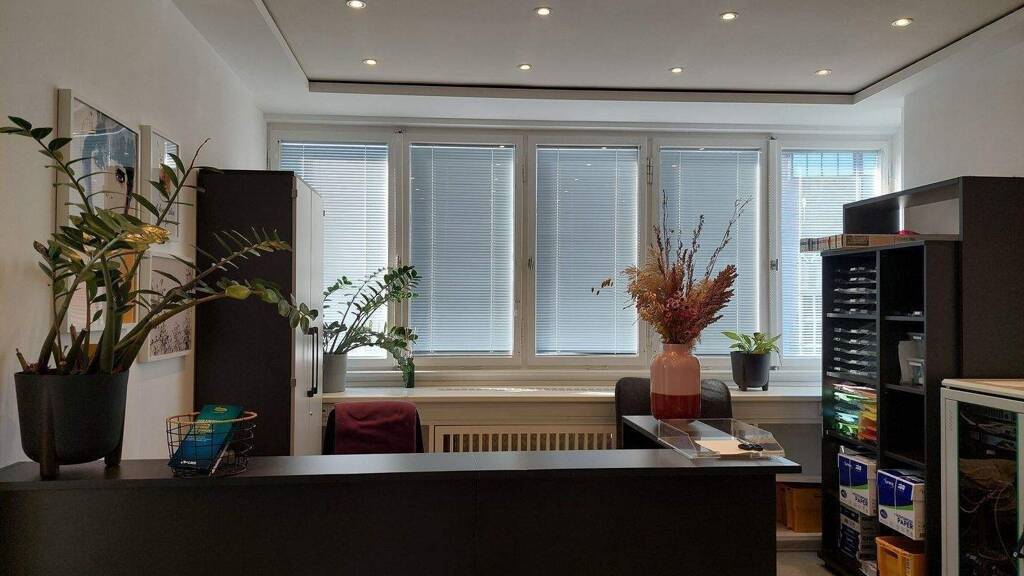 Zwei große separate Büroräume, ein geräumiges Empfangszimmer und ein Großraumbüro bilden momentan eine Einheit. Andere bzw. weitere Aufteilung der Fläche, z.B. in mehr einzelne Bereiche, ist möglich.