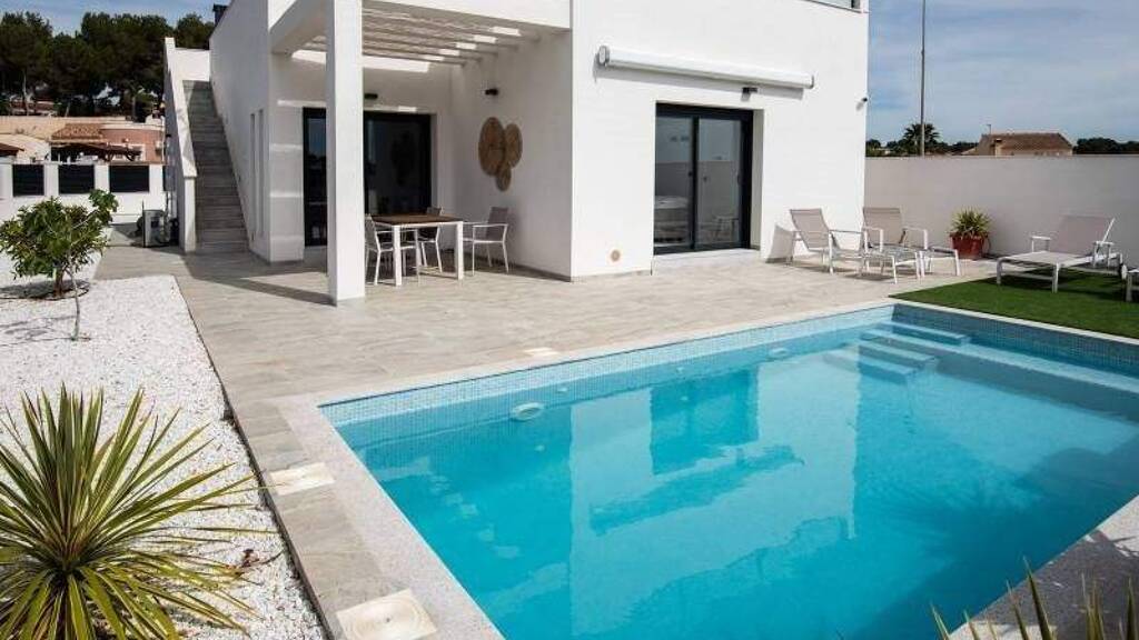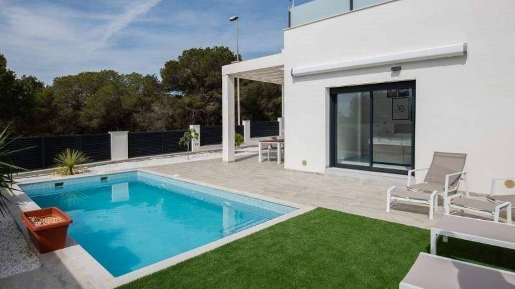 Befindlich im reizvollen Umfeld von Pinar de Campoverde bietet dieses Ensemble aus 9 unabhängigen Wohneinheiten einen exklusiven und komfortablen Lebensstil. Die Typologie der Immobilien ist "Unabhängig", was Privatsphäre und eine ruhige Atmosphäre für die Bewohner garantiert. Die Nähe zum Flughafen, nur 11 km entfernt, verleiht einen erheblichen Mehrwert für alle, die eine schnelle und einfache Anbindung an andere Städte suchen. Diese Wohnungen sind darauf ausgelegt, höchsten Komfort zu bieten, indem sie moderne und funktionale Merkmale integrieren, die sich an die Bedürfnisse jeder Familie anpassen. AUSSENBEREICHEN Die Wohnungen zeichnen sich durch ein Außendesign mit privatem Garten aus, ideal, um das mediterrane Klima zu genießen. Zudem verfügt jede Immobilie über eine Terrasse und ein Solarium, perfekt zum Entspannen im Freien oder für Familienfeiern. Die Präsenz eines Privatpools in jeder Wohnung verleiht einen Hauch von Luxus und Exklusivität, sodass die Bewohner ein erfrischendes Bad in der eigenen Wohnung genießen können. Der Zugang zu einer privaten Garage sorgt für Bequemlichkeit und Sicherheit beim Parken. INNENRAUM Die Inneneinrichtung dieser unabhängigen Wohneinheiten ist sorgfältig gestaltet, um Komfort und Funktionalität zu bieten. Die Immobilien sind in Konfigurationen mit 2 oder 3 Schlafzimmern erhältlich, jeweils mit 2 Bädern, was Flexibilität für unterschiedliche familiäre Bedürfnisse ermöglicht. Die Innenräume sind mit Klimaanlage ausgestattet und gewährleisten das ganze Jahr über eine angenehme Atmosphäre. Eingebaute Schränke bieten effizienten Stauraum, während die enthaltenen Elektrogeräte und Möbel einen sofortigen Umzug erleichtern. Der keramische Boden verleiht eine moderne Note und ist pflegeleicht. Zusätzlich sorgt der Gegensprechanlage für ein zusätzliches Sicherheits- und Komfortniveau. GEMEINSCHAFTSBEREICHE Die Residenz bietet Gemeinschaftsparkplätze, eine praktische Lösung für Besucher und zusätzlichen Platz für die Bewohner.