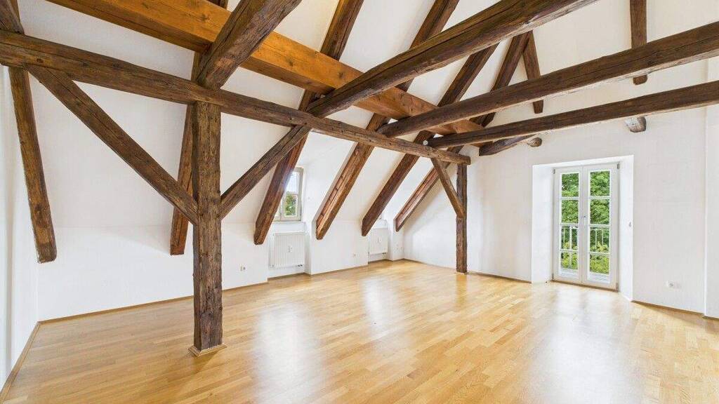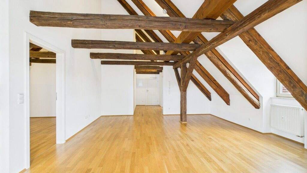 Die Wohnung beeindruckt mit Raumhöhen von bis zu fünf Metern, die zusammen mit den sichtbaren Holzbalken ein einzigartiges Wohngefühl schaffen. Große Fensterflächen sorgen für eine optimale Belichtung und verleihen den Räumen eine freundliche, lichtdurchflutete Atmosphäre.