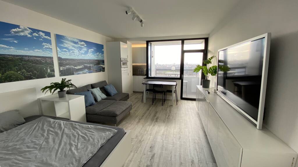 Die helle Wohnung bietet Platz für 1-2 Personen und verzaubert mit kontemporärer und grosszügiger Atmosphäre. Ausgestattet mit 70" Großbild-TV, Loungesofa und Arbeits-/Esstisch, gelangt man auf den Balkon mit einem spektakulärem Panorama über die Stadt Richtung Westen. Die kleine Küche ist vollständig ausgestattet mit Kaffeemaschine Kühlschrank, Geschirrspüler, Induktions-Herd, Kombi-Mikrowelle und vielem mehr. Das komplett neu renovierte