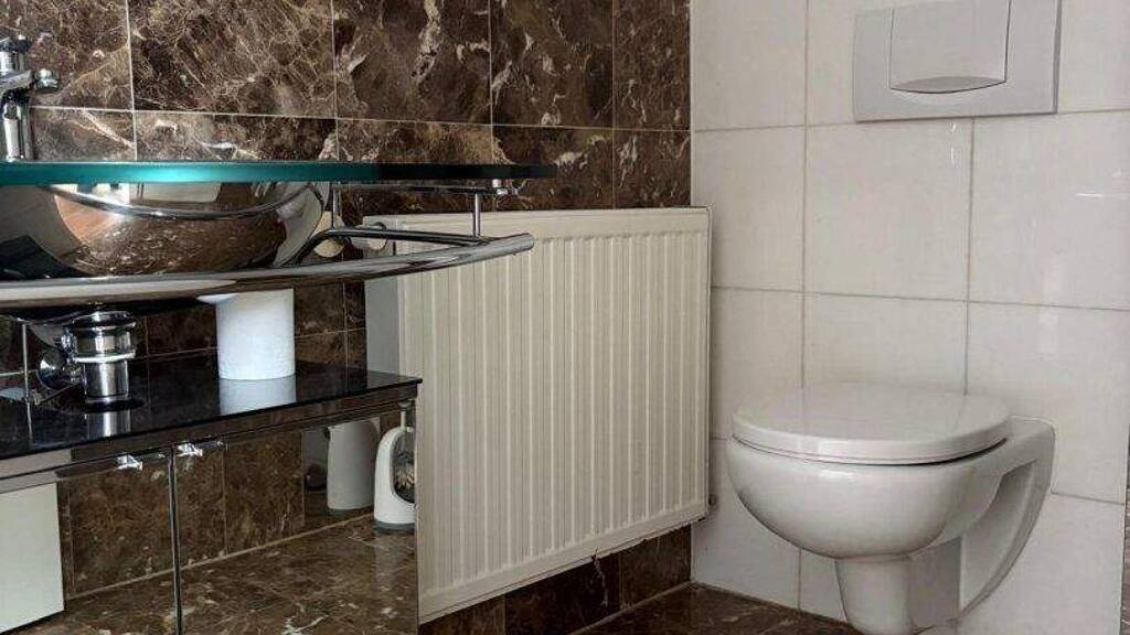 Das Badezimmer wurde mit Mamorfliesen (Boden, Wand) ausgestattet.