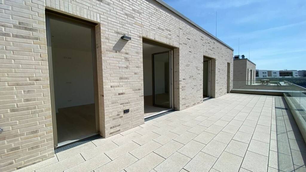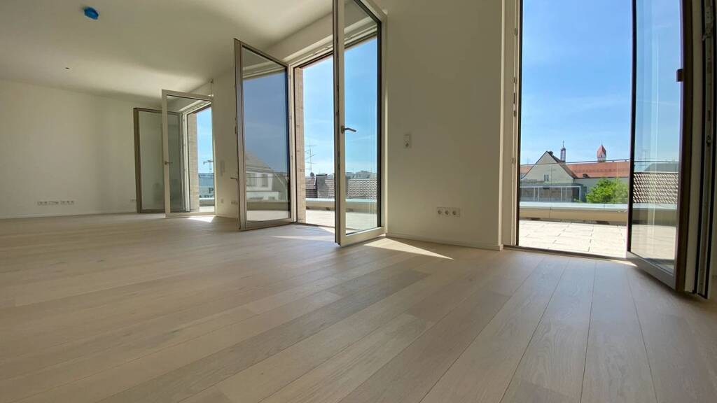 Diese lichtdurchflutete Dachgeschoßwohnung mit ihren 121 m² Wohnfläche besticht durch die große, sonnige Dachterrasse und das geräumige Wohn- und Esszimmer. Im 3. OG betreten Sie den Eingangsbereich von welchem aus Sie alle Räume erreichen können. Auf der linken Seite reihen sich das Hauptschlafzimmer mit dazugehörigen großzügigen Badezimmer und das Kinderzimmer mit anschließenden Gäste-WC und Dusche sowie einem Arbeitszimmer.Zur rechten Hand befindet sich der stylische Wohn- und Essbereich. Die Räumlichkeiten bestechen durch die großzügige Raumhöhe sowie die zahlreichen bodentiefen Fenster, welche diese Wohnung zu einem besonderen Highlight machen. In allen Wohnbereichen ist gebürstetes, matt lasiertes Eichenholzparkett verlegt, in den Bädern hochwertiger Fliesenbelag. Die stilvoll eingerichteten Badezimmer bestechen durch bodentiefe Glas-Duschen und eine Badewanne. Neben einem geräumigen Kellerabteil gehört zu der Wohnung ein eigener Tiefgaragenstellplatz mit Steckdose.