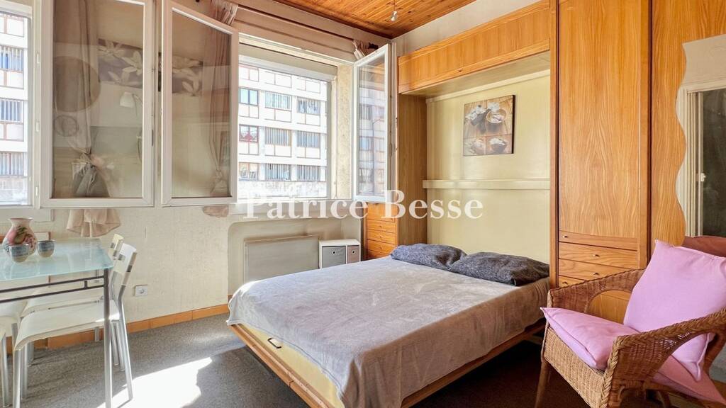 This studio apartment that is bathed in light has a surface of approximately 20 m² and is on the first floor of a small two-storey building, which is typical of Marseille and most probably dates from the late 19th century. It possesses a sober facade punctuated by straight windows and a wooden entrance door. There is a shop on the ground floor.A curved staircase with a wrought-iron balustrade and steps paved with terracotta tiles leads to the two floors, on each of which there are two apartments.The south-facing apartment is bathed in light throughout the day, through two double-glazed windows with manual roller shutters, while its pleasant ceiling height of 2.9 m provides a feeling of space.It is made up of main room with a fold-away bed that can be concealed in wooden cupboards when not used, enabling the space to be optimised. There are also an open-plan kitchen area and a shower room with a washbasin as well as a lavatory.The ceiling is made of warm-toned wood panelling, the floor of the main room is carpeted and there is linoleum in the kitchen area. As for the bathroom, it boasts light-coloured tiling. Lastly, next to the apartment, another lavatory can be reached via the landing.