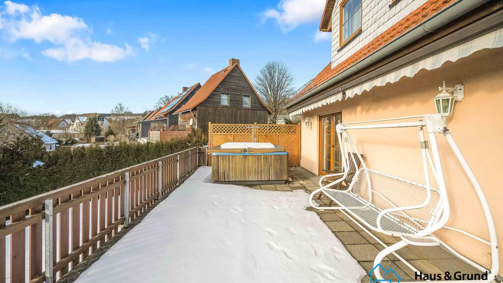 Herzlich willkommen im romantischen Elend. Dieses Einfamilienhaus wurde 2000 von den Eigentümern erbaut und bis vor kurzem auch noch bewohnt. Aus Altersgründen steht nun der Verkauf an. Sie haben also die Chance ein verhältnismäßig „neues“ Haus in diesem Ort zu erwerben. Das Eckgrundstück ist mit über 1400 m² nicht grade klein und bietet somit viel Platz. Aufgrund der derzeitigen Begrünung stehen Ihnen eine Vielzahl von Gestaltungsmöglichkeiten zur Verfügung. Ob Pool, eine große Spielfläche für Kinder, Bette für Blumen oder Obst und Gemüse, hier kann das Gartenherz höher schlagen. Aktuell kümmert sich vor allem der Mähroboter um einen gepflegten Rasen. Auf das Grundstück gelangen Sie über die nördlichen Seite. Hier ist auch gleich die Tiefgarageneinfahrt. Praktisch gelöst ist das vorliegende elektrische Tor. Durch die leichte Hanglage ist die im Südosten liegende Terrasse (es wurde kein Wintergarten wie geplant gebaut) etwas erhöht. Dadurch können Sie einen wunderbaren Ausblick genießen. Die im Garten gepflanzten und nun schon gut gewachsenen Bäume bieten einen wunderbaren Sichtschutz für Ihre Privatsphäre.
