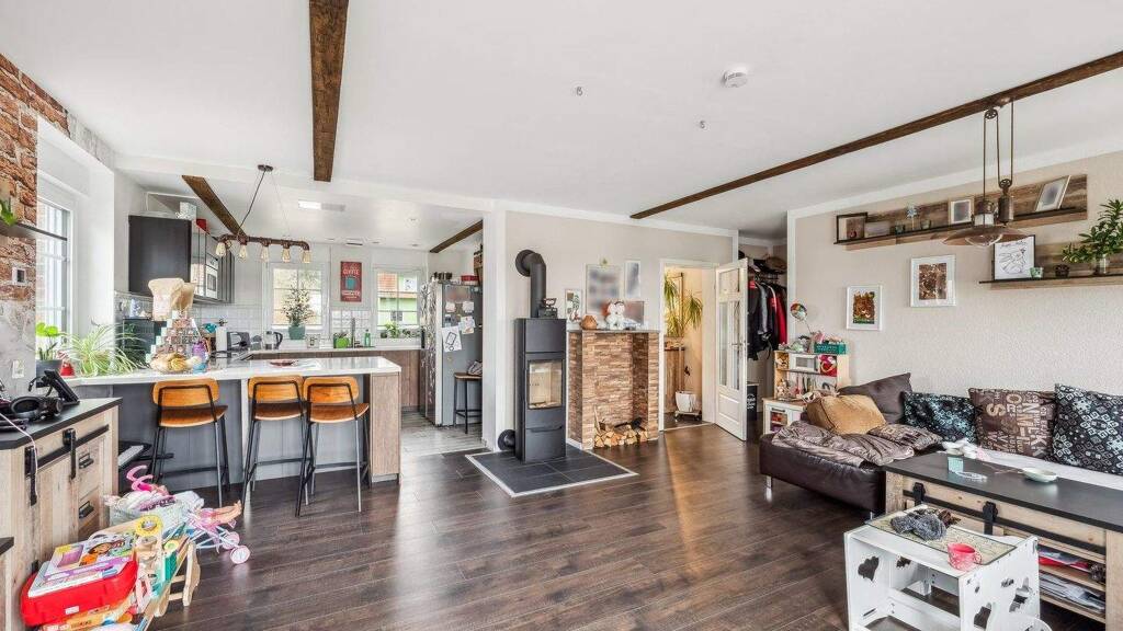 Die Einbauküche fügt sich harmonisch in den Wohnbereich ein und bietet alles, was das Herz begehrt. Jalousien an allen Fenstern gewährleisten zu jeder Zeit ausreichend Sicht- und Sonnenschutz. Der Spitzboden bietet zusätzlichen Stauraum.