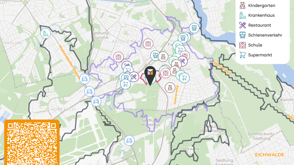 Das Haus selbst befindet sich direkt am Dorfplatz gegenüber der alten Dorfkirche im Hinterhof des Grundstücks. Der Flughafen Berlin-Schönefeld ist lediglich ca. 10 Autominuten entfernt. Eine Buslinie verkehrt direkt am Dorfplatz. Der S- Bahnhof Altglienicke ist ebenfalls Fußläufig erreichbar. Von hier aus kommen Sie schnell in das Stadtzentrum oder zum Flughafen Schönefeld.