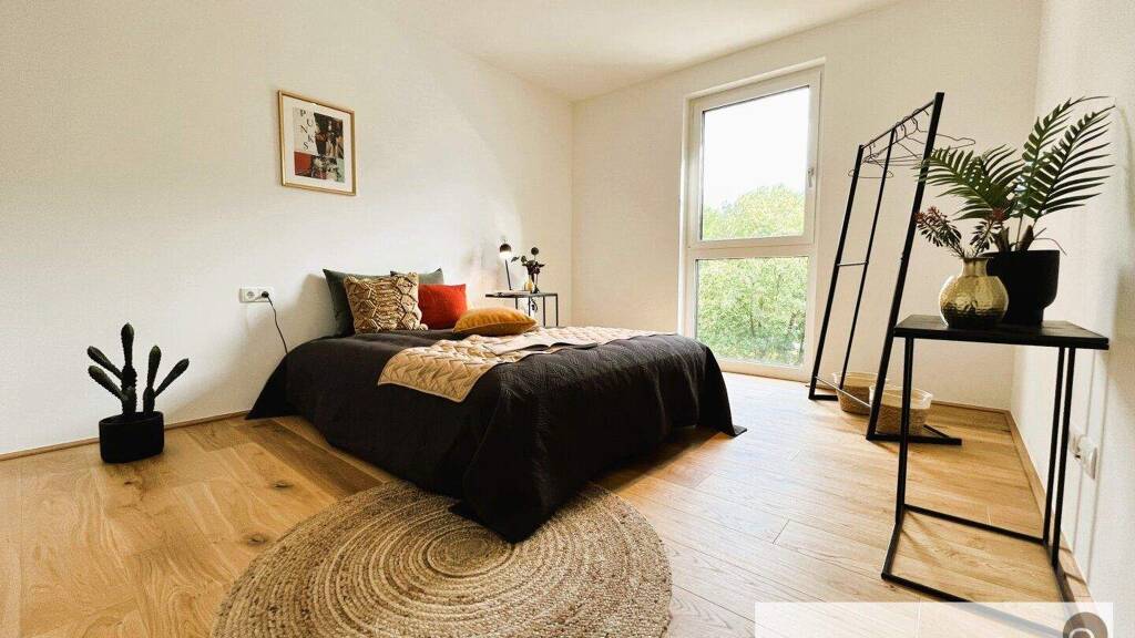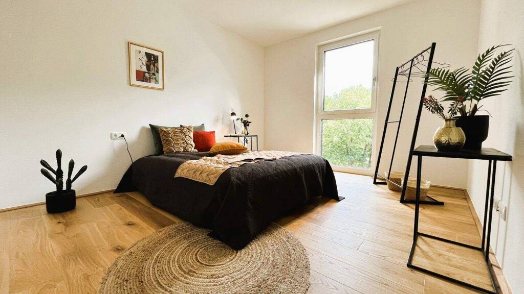 Die Wohnung überzeugt durch einen hochwertigen Eichen-Echtholzparkettboden, zeitlos schönen Feinsteinzeug-Fliesen, einer modernen Walk-In-Dusche und im Preis inkludierte elektrische Raffstores mit Funkfernbedienung. Mittels Centerbox können die Raffstores zusätzlich über Handy/Tablet gesteuert werden. Die 2 Balkone sind mit einem wunderschönen Holzlattenrost-Boden aus Lärchenholz ausgestattet. Weiterer Pluspunkt: Die 3-Zimmerwohnung erhält eine dezentrale Komfortlüftung mit Wärmerückgewinnung und Feuchteschutz.