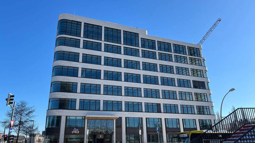 Das von MASKE + SUHREN entworfene 32 Meter hohe Bürogebäude schafft auf 9 Ebenen und einer Dachterrasse inspirierende Freiräume und tolle Kommunikationsflächen. Im Erdgeschoss sorgen Läden und Gastronomie für zusätzliches Leben. Die Fassade des Gebäudes ist aus Travertin und große Glasflächen und abgerundete Ecken sorgen für Leichtigkeit. Helle Teambüros, Open Space Flächen und hochwertige Konferenzräume ermöglichen moderne Office-Lösungen. Das Objekt stellt sich mit zahlreichen Extras optimal den Anforderungen an zukunftsorientierte Bürokonzepte.