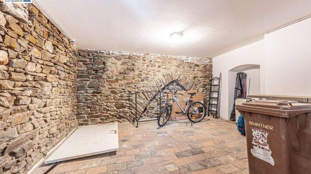Der "hintere" Teil des Erdgeschosses beherbergt denn allgemein genutzten Lager- und Müllraum des Objektes und gibt den Blick auf die massiven Steinmauern frei, die in diesem Bauwerk für das Gefühl der Geborgenheit sorgen.