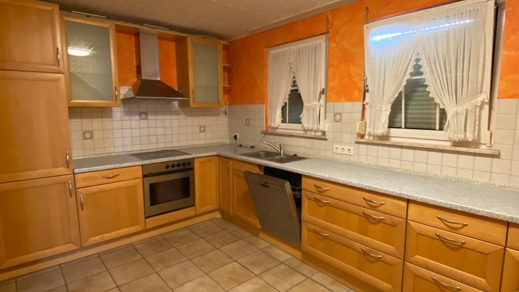 Die Wohnung befindet sich im 1. OG eines 2-Familien-Hauses in Orsfeld. Die Küche ist ausgestattet mit Kühlschrank, Cerankochfeld, Backofen, Dunstabzug und Spülmaschine. Weiterhin verfügt die Wohnung über einen großen Wohn-/Eßraum, der durch das bodentiefe Fenster sehr hell ist. Das Bad (Tageslichtbad) ist mit Dusche und Badewanne ausgestattet. Desweiteren sind 2 Schlafzimmer, Flur und ein Abstellraum vorhanden. Die Wohnung verfügt außerdem über 1 Kellerraum und 1 Außenstellplatz. Im Haus gibt es einen Gemeinschaftsraum für den Anschuß von Waschmaschiene u. Trockner. Gartenmitbenutzung.