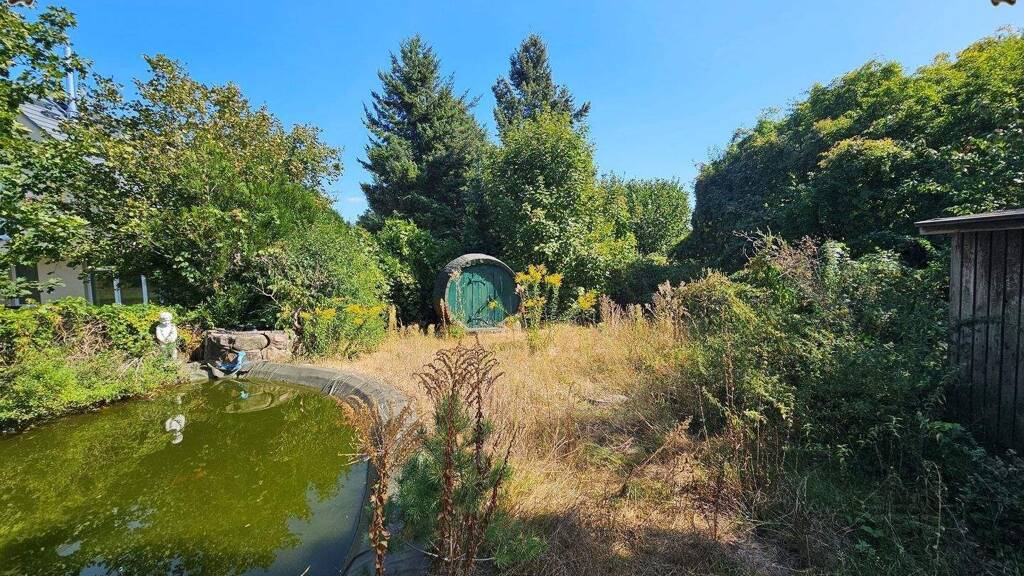 Der hinter der Remise beginnende Gartenbereich ist momentan in einen sehr schlechten Zustand, hier befindet sich neben einem Teich noch zwei alte Schuppengebäude.