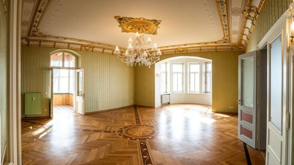 Die übrigen vier Wohnungen, bestehend aus rund 530 Quadratmetern, sind vermietet. Alle Wohnungen des Schlosses zieren aufwendig gestaltete Bembé-Echtholz Parkettböden. So befindet sich beispielsweise im ehemaligen Musiksalon ein wunderschönes Tafelparkett mit Intarsien. Ein anderer Salon verfügt über einen hochwertigen Kamin, der für gemütliche Stim-