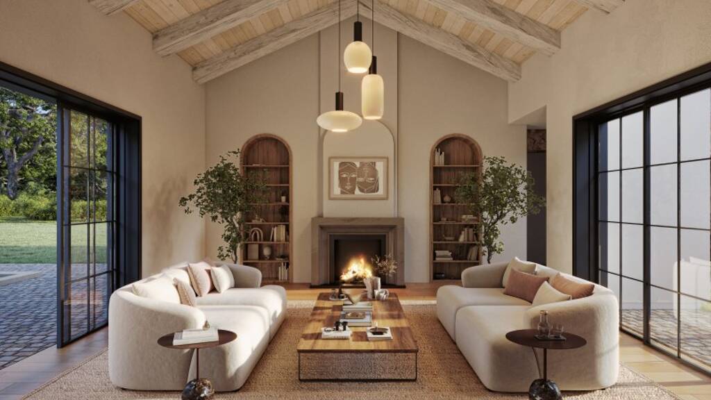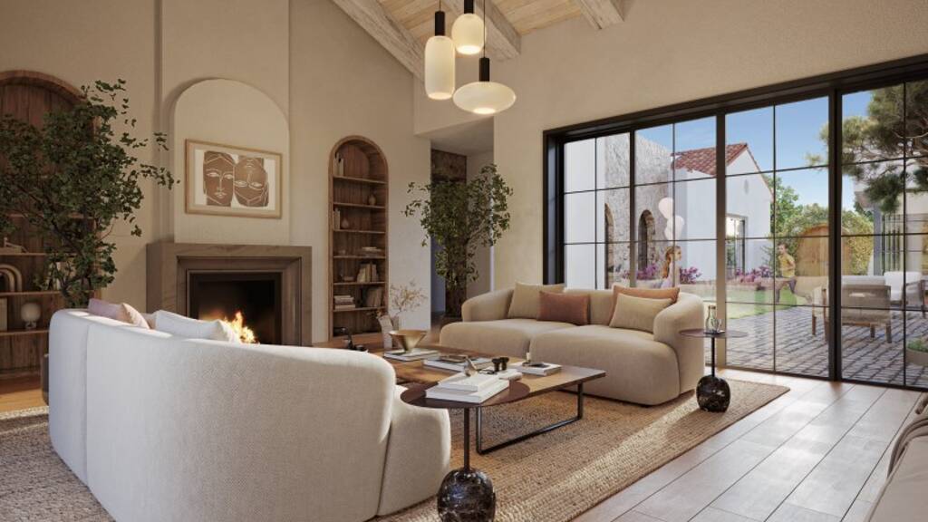 Der Sozialbereich umfasst ein gemütliches Wohnzimmer mit Kamin, das sich zu einem großen Garten mit Pool auf der einen Seite und einem charmanten Patio auf der anderen Seite erstreckt. Die moderne, funktionelle Küche wurde mit einem integrierten Essbereich ausgestattet. Zu dem Projekt gehört auch ein überdachter Carport für zwei Fahrzeuge.