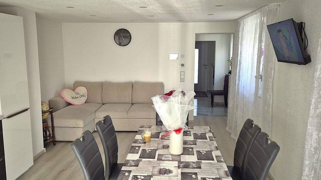 Die Wohnfläche verteilt sich im Erdgeschoss auf den Eingangsbereich/Flur/Treppenhaus, Bad mit Fenster und den großzügigen Küchen- Wohn- und Essbereich mit Terrassenzugang.