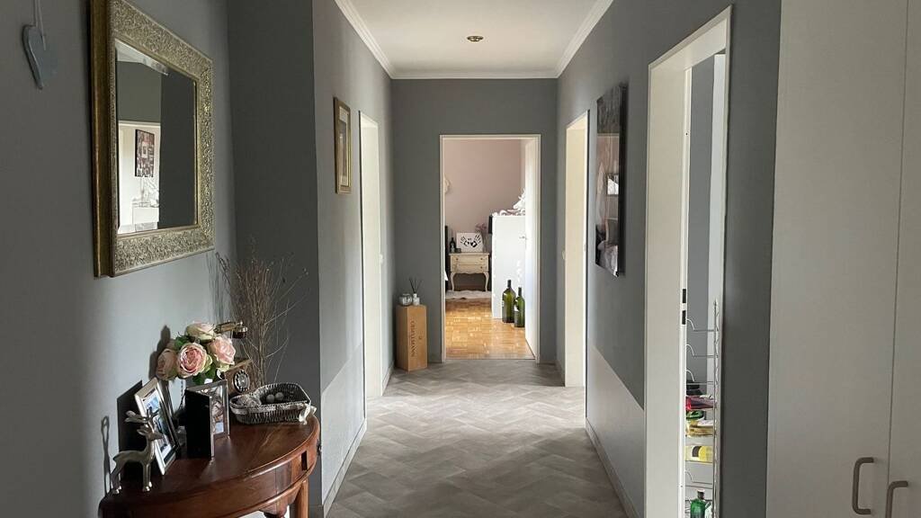 Trotzdem ein paar Details. Der Balkon bietet Morgensonne satt und ist vom Schlafzimmer aus begehbar. Im Wohnzimmer lassen sich die bodenlangen Fenster im Essbereich vollständig öffnen. Dort werdet ihr von der Abendsonne verwöhnt. Alle Zimmer gehen vom Flur ab, in dem es ausreichend Stauraum durch einen Einbauschrank gibt.