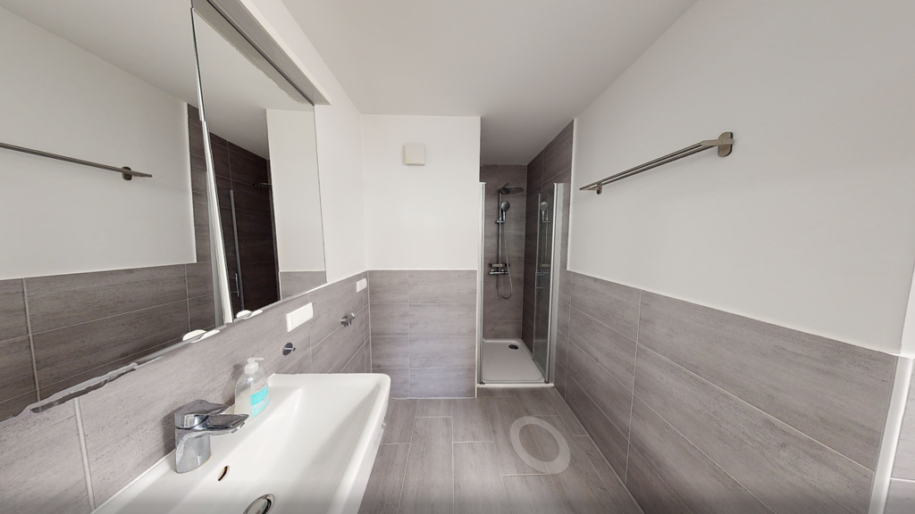 Das modern gestaltete Badezimmer überzeugt durch seine zeitlose Ausstattung. Ergänzt wird die Wohnung durch einen praktischen Abstellraum, der zusätzlichen Stauraum für Haushaltsgeräte, Vorräte oder Reinigungsmittel bietet.