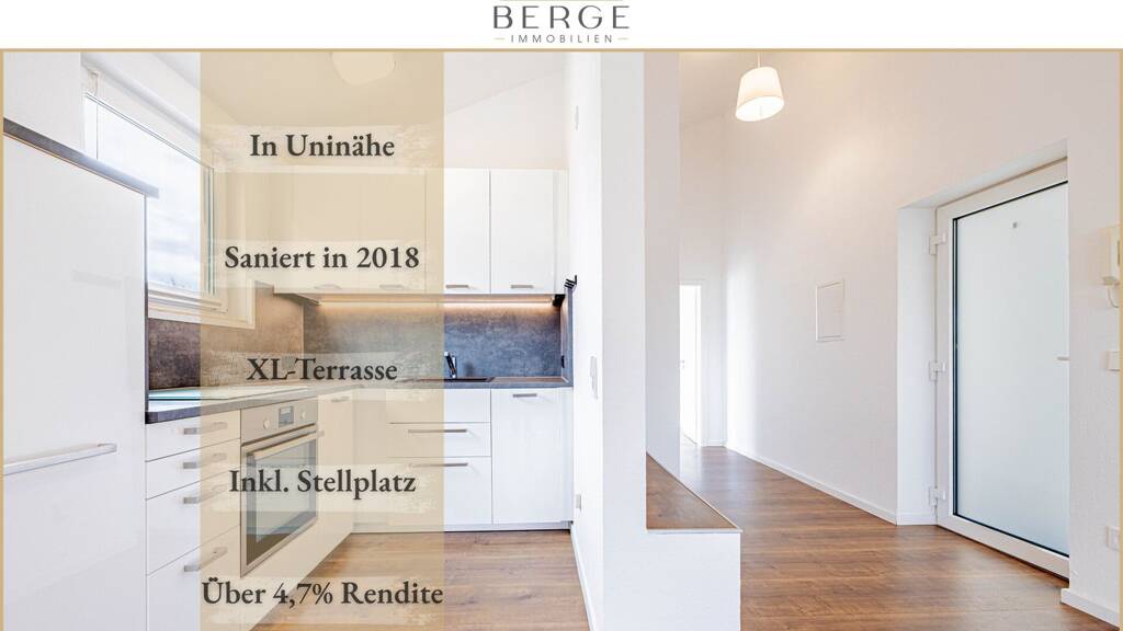 Das Highlight: die Dachterrasse erstreckt sich einmal über die ganze Länge der Wohnung und ist sowohl von Schlaf- als auch von Wohnzimmer zu betreten. Aufgrund der Größe & Bauform bekommen Sie hier mit der Ostausrichtung ganztags Sonne und ein Stück Ruhe inmitten der Stadt geboten. Ebenfalls staunen werden Sie über das modern hergerichtete Bad inkl. Wanne & die tolle Deckenhöhe aufgrund des Pultdachs - hier haben wir ein luftiges Raumgefühl über fast 4 Meter! Die Wohnung wurde erst im Jahr 2018 gänzlich frisch saniert und seither vom Eigentümer selbst bewohnt, was Sie im Zustand der Wohnung auch sehen. Eine moderne Einbauküche gehört ebenfalls dazu & ist im Preis inklusive!